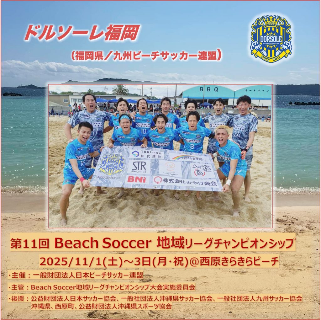 今年度も、地域チャンピオンシップに出場できる事に嬉しく思っています。また、今大会に関わって下さる関係者の皆さまに感謝致します。昨年度は、ベスト8で敗れてしまったため、今年はそれ以上の結果を出したいと思っています。ドルソーレ福岡は「仕事」「練習」「地域貢献」全てを全力で頑張るチームです。 ビーチサッカーという、競技の素晴らしさを、ピッチ内外で最大限に表現し、大会を盛り上げたいと思います。今大会を通し、ファン、サポーター、地域の方々に感動と興奮、夢を与えられるよう、砂を喰い全力で戦う事を約束します。