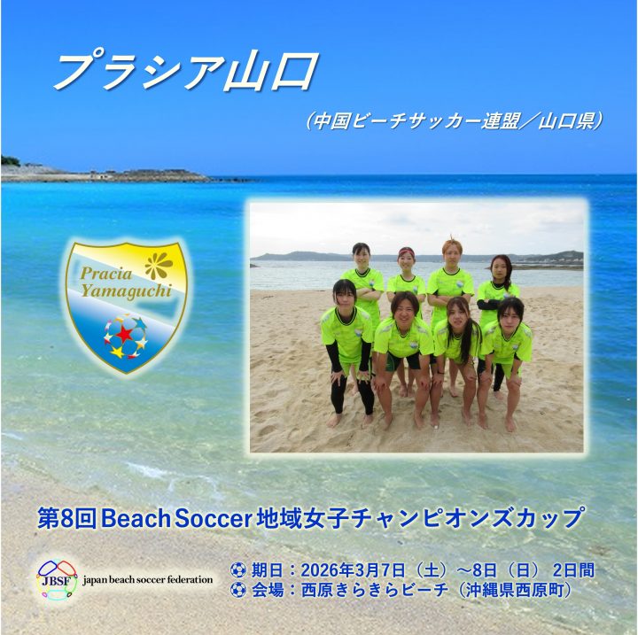プラシア山口は、2024年にビーチサッカー女子チームを設立し、第8回BeachSoccer地域女子チャンピオンズカップに3度目の挑戦をします。昨年、大会に出場させて頂いてからのこの1年、色々なチームとの練習試合や様々な大会等に参加させて頂きながら、一歩一歩進んできました。若い選手が多く、まだまだ経験不足ではありますが、ビーチサッカーに対する熱い気持ちは誰にも負けません。今大会は、前回かなわなかった予選突破、そして優勝目指して、頑張ります。