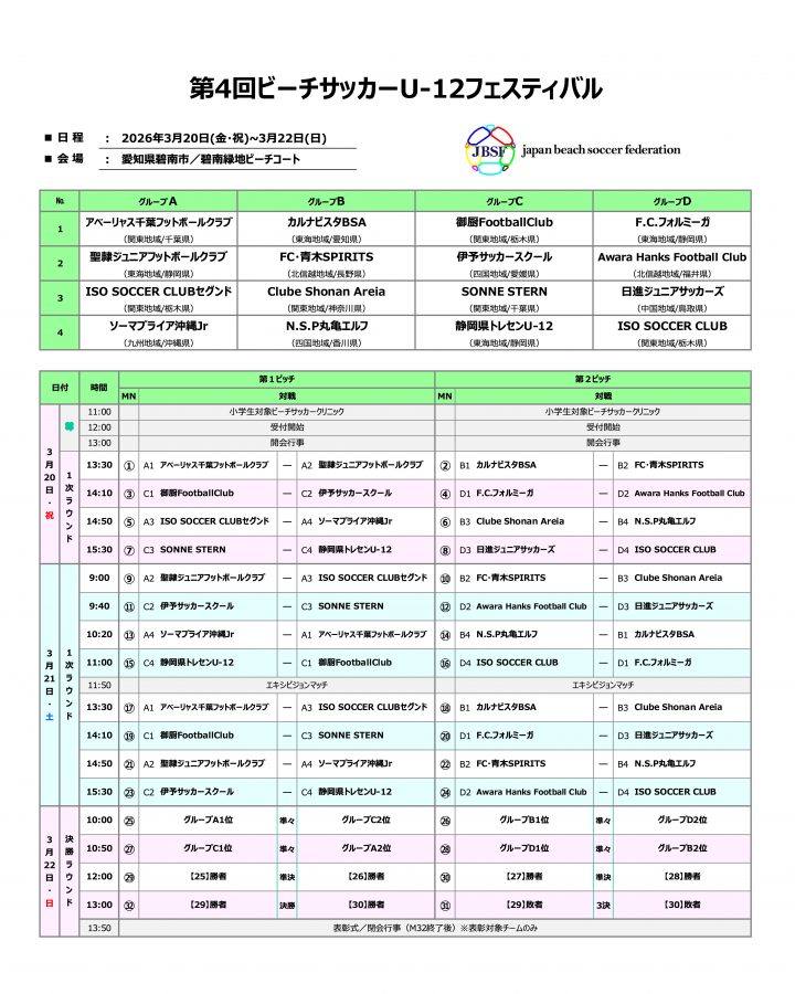 2026年3月20日(祝)〜3月22日(日)に愛知県碧南市「碧南緑地ビーチコート」で開催される、JBSF主催「第4回 Beach Soccer U-12フェスティバル」について、参加チーム・組み合わせが決定しましたのでお知らせいたします。