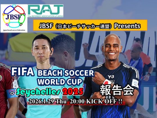 全国のビーチサッカーファミリーの活動をリレー形式で伝える【ビーチサッカー連盟だより】(「JFA news」『蹴球通信』欄内)。今回は1月29日にRAJ(一般社団法人日本サッカー審判協会)と合同でWEB開催の「FIFAビーチサッカーワールドカップセーシェル2025 大会参加報告会」の模様をご紹介いたします。